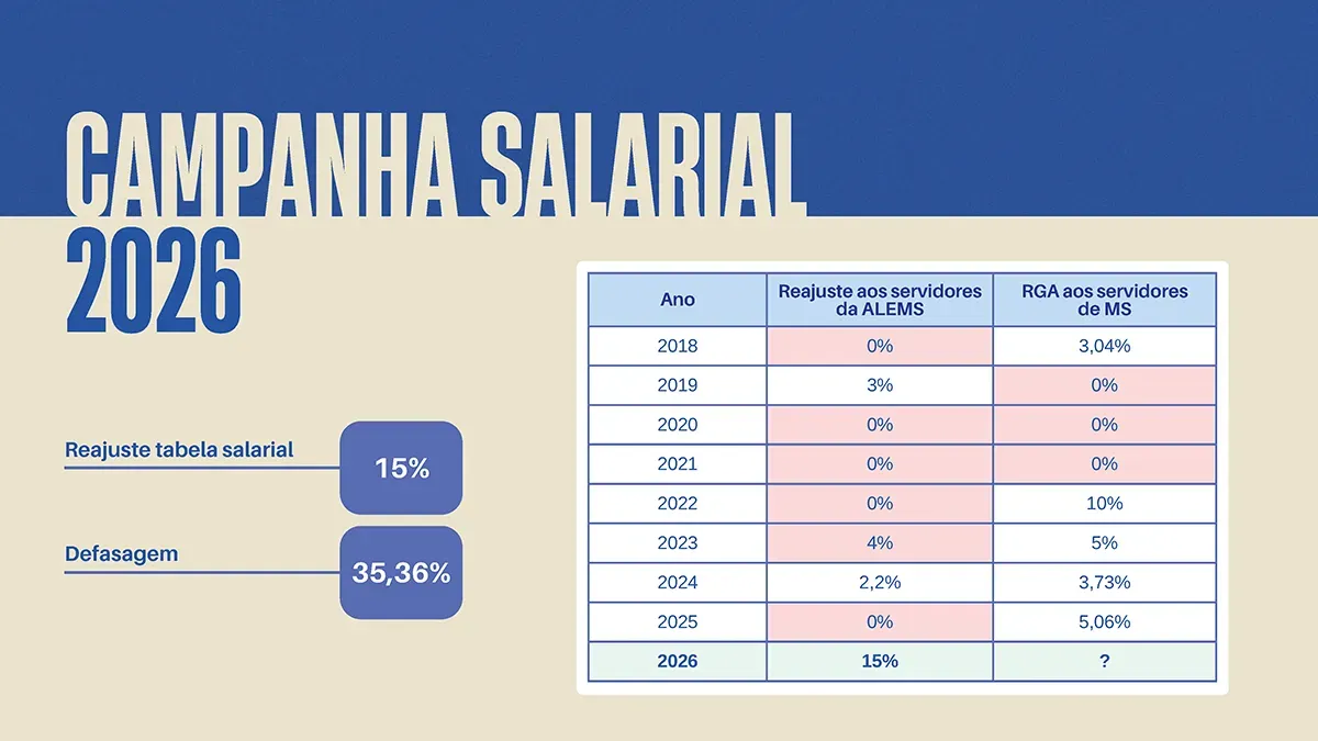 Em assembleia realizada em 12/02, os filiados definiram a pauta de 2026, que inclui antecipar a reunião de apresentação dos pleitos, reajustar a tabela salarial, melhorar os auxílios (saúde, transporte e alimentação), publicar os adicionais de qualificação pendentes e realizar uma reunião aberta com servidores e deputados para apresentar a campanha salarial 2026.